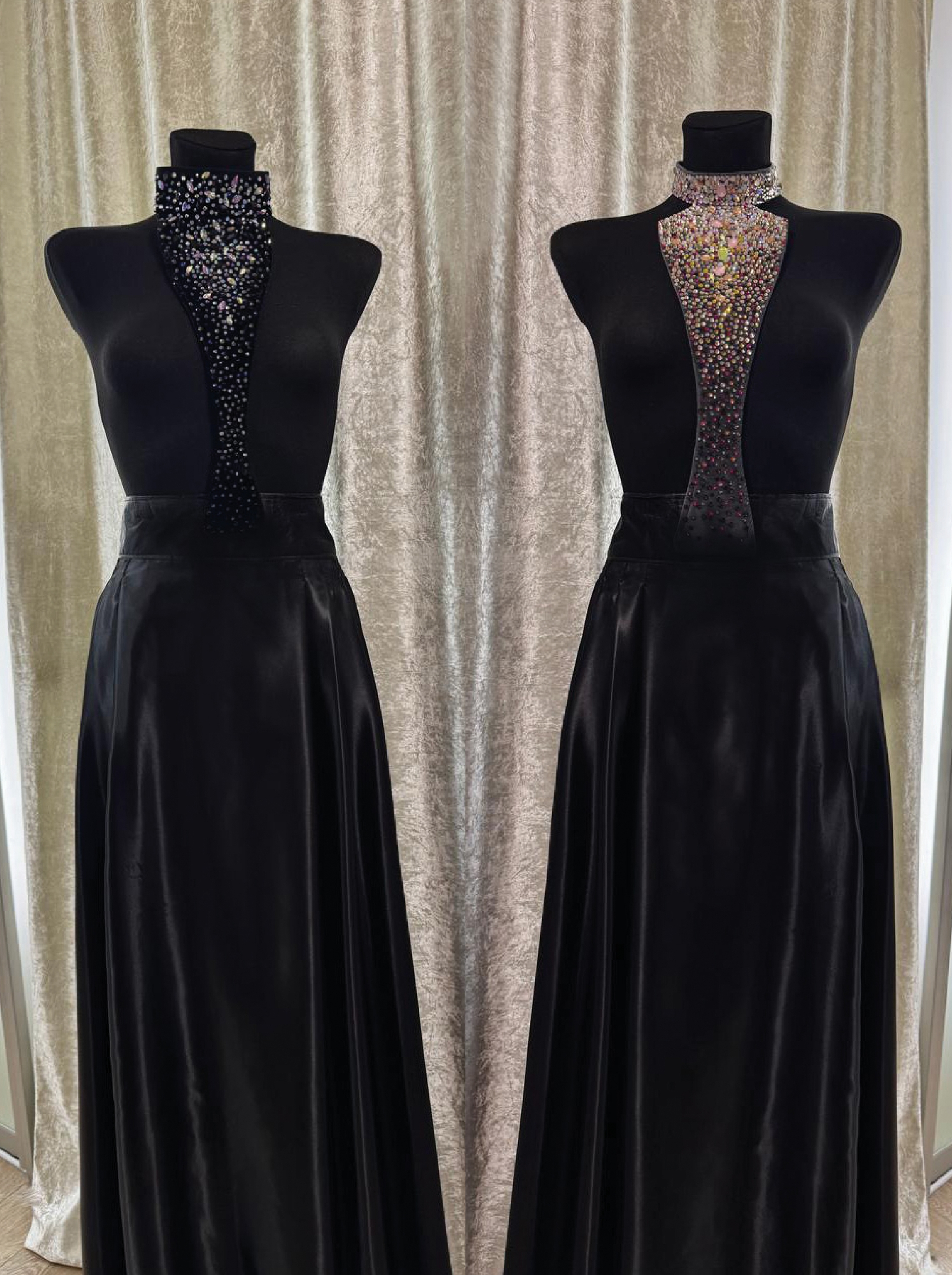 Снизу держится на талии за счёт тонкого ремешка (ремень заменяем — в цвет юбки/платья)