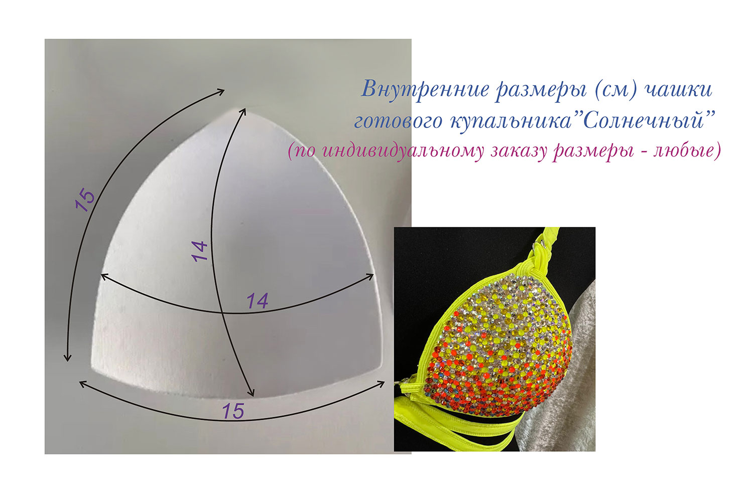 На небольшую грудь. Мягкий крой – без «косточек». Двухфункциональный купальник-трансформер: декоративный верхний слой со стразами снимается. Нижние чашки-пуш-ап создан для пляжного отдыха: в нём можно плавать в водоеме.